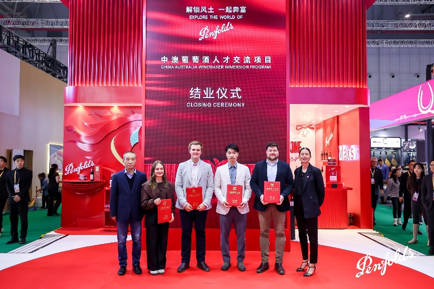 在深化本土合作、赋能行业发展方面,富邑葡萄酒集团同样不遗余力。11月6日,首届中澳酿酒师人才交流项目结业仪式在奔富展台顺利举办,在中国酒业协会葡萄酒分会秘书长火兴三、澳大利亚葡萄与葡萄酒协会政府关系总监Lisa Scott和富邑葡萄酒集团全球企业事务总监Prue Deniz的共同见证下,四位来自中澳的酿酒师人才圆满毕业。