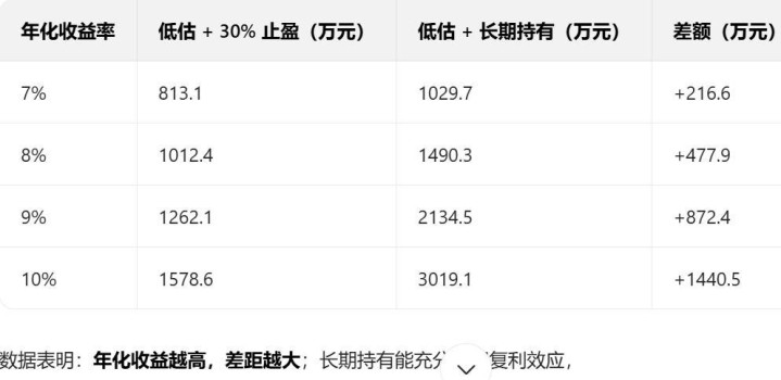 在高年化收益环境(>8%)下,长期持有策略优势明显,收益差距可达数百万元;在低年化收益环境(≈7%)下,差距相对较小,但长期持有仍更优;若能准确判断低估与高估,低估 + 30% 止盈策略可在震荡市提高资金周转率;但在单边上涨或长周期牛市中,长期持有收益更高。
